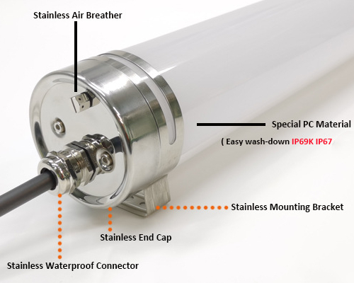 304 stainless steel lamp end caps paired with customizable PC/PMMA lamp bodies — ideal for farms and food factories, delivering superior lighting performance. The lamp body resists cracking and yellowing even with long-term use, ensuring lasting durability.